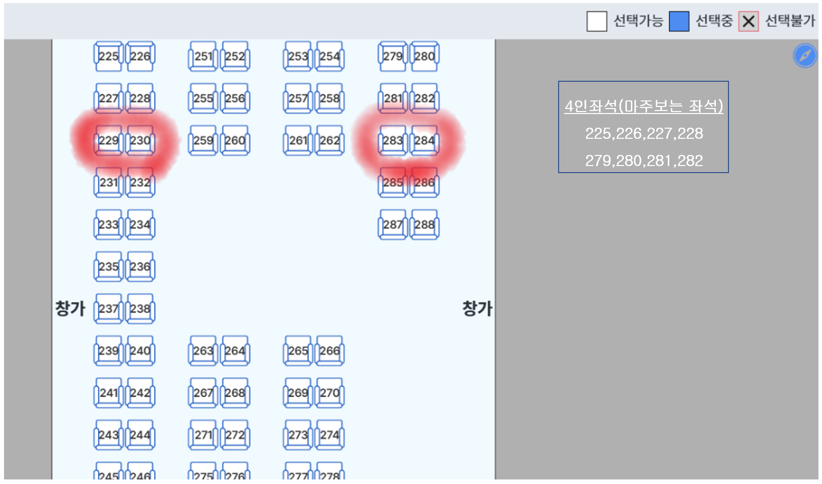 2층 앞에서 3번째 자리(좌,우) 추천드립니다. 좌석번호 229,230,283,284