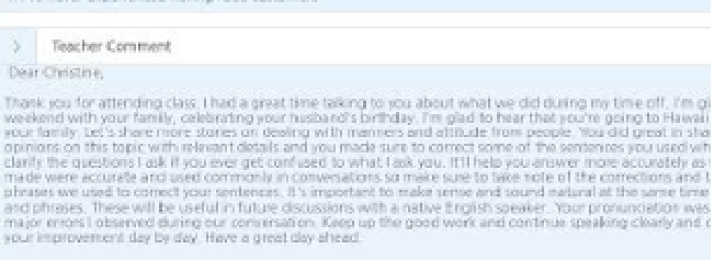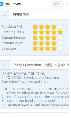 나와의 통화를 영역별로 체크해주고 내가 잘못말했던 부분을 고쳐준다. | 마지막을 선생님의 평을 전체적으로 적어주어 용기도 주고 단점도 말해준다. |