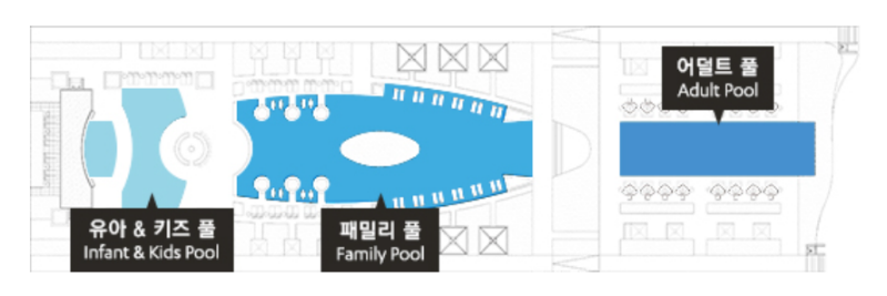 먼저 수영장은 유아/키즈풀과 어덜트/패밀리풀로 바닷가쪽으로 길게 위치해 있습니다.