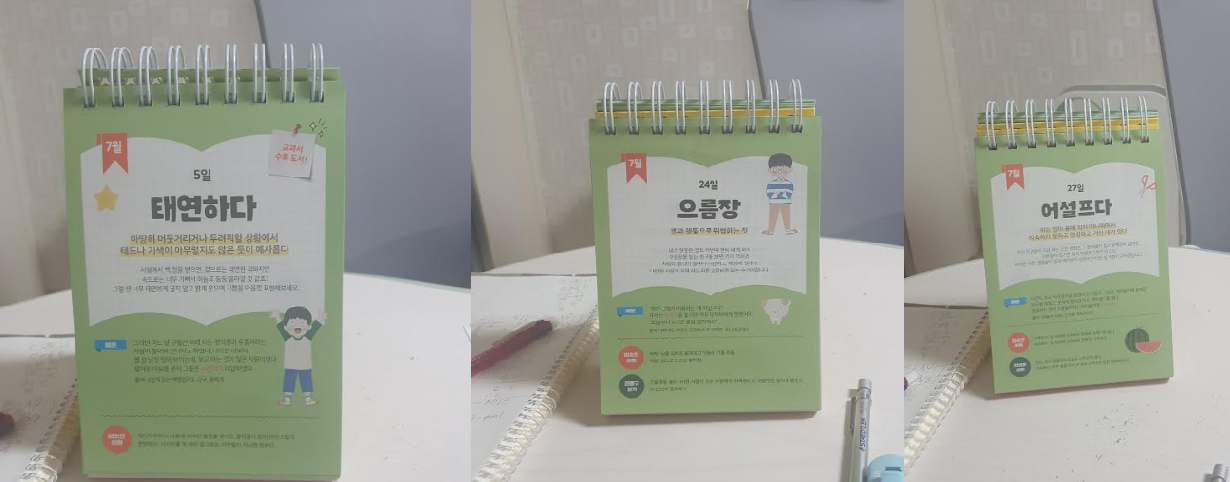달력식으로 되어있고 하루에 한 개의 어휘만 나와있고 뜻은 물론이고 예문과 비슷한 어휘 그리고 반대말 어휘가 함께 나와있어 아이가 이해하기에 쉽게 되어 있습니다. 아이 책상에 놓고 그냥 수시로 그냥 보게 하고 한 번씩 그 뜻을 물어보면 끝입니다. 아이가 처음에 몰았던 어휘였는데도 생각보다 잘 알더라고요. 신기했습니다. 금액도 부담이 없으니 한번 사서 아이가 수시로 볼 수 있는 곳에 놓아두면 좋을 것 같아요.