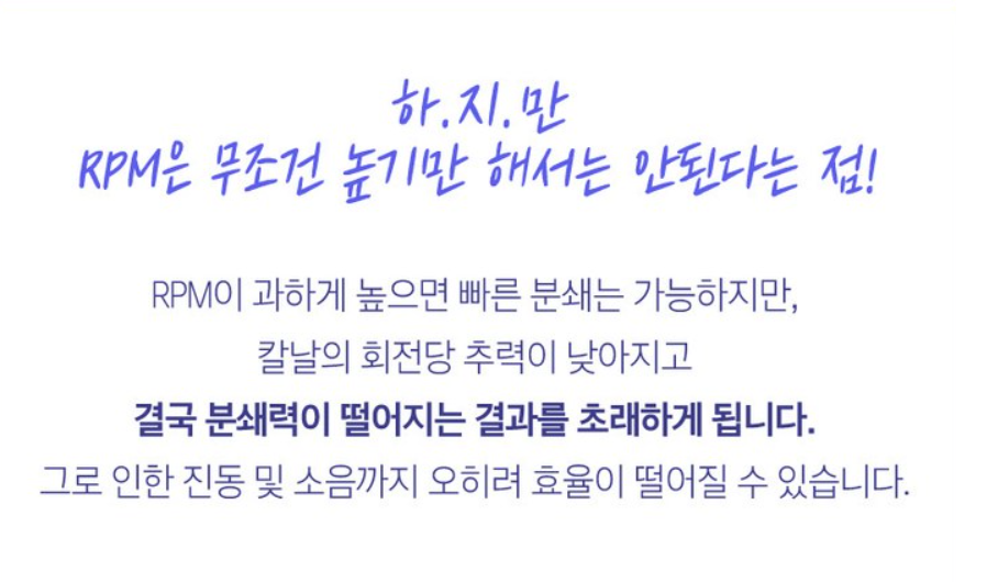 분쇄가 잘 되는 것이 가장 중요할 것 같다. 기존에 있던 제품은 분쇄가 잘 되지 않아 음료를 갈아먹을 때 약간 불편한 감도 있었기 때문에 어차피 새로 장만하는 믹서기는 분쇄기능이 중요했다. 빠르고 미세한 블렌딩은 RPM이라는 것을 보면 되는데 이것이 내가 믹서기를 선택하는 기준이 되었다.
