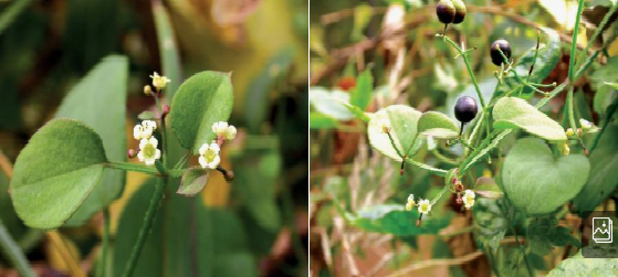 | 성질 및 모양 | 꼭두서니는 차가운 성질이며 쓴맛이 있습니다. 가삼자리, 갈퀴잎이라고도 불리는 덩쿨식물입니다. 줄기가 1m정도 뻗어나가고 네모졌으며 짧은 가시가 있습니다. 잎은 끝이 뾰적한 하트형이며 7~8월에 연황색 꽃이 피고 9월에 둥근 열매가 검은색으로 익습니다. 옛부터 뿌리에서 붉은색 염료를 얻는 식물로 널리 알려져 왔지만 합성염료가 개발되고 부터는 쓰이지 않습니다. |