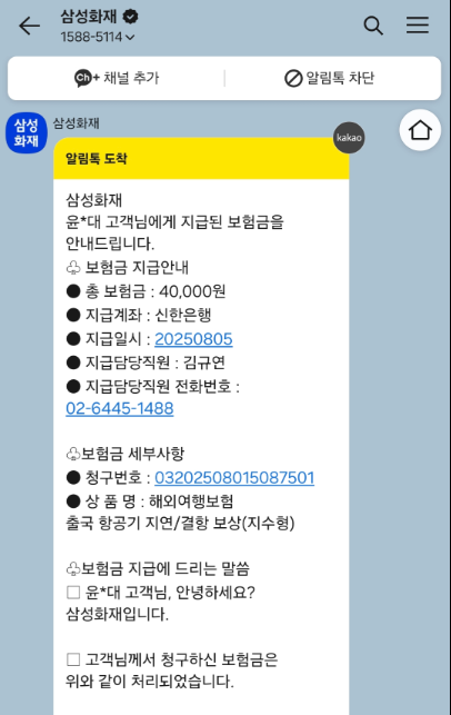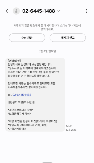 그리고 출발일이 일요일이라 미성년자인 제 아들은 바로 신청을 못하였고.. 여행 복귀 후 삼성화재(1588-5114)로 전화합니다. 담당자가 연락준다는 고지를 받고 다음날 담당자가 문자로 신청방법, 필요서류등을 안내해 줍니다.