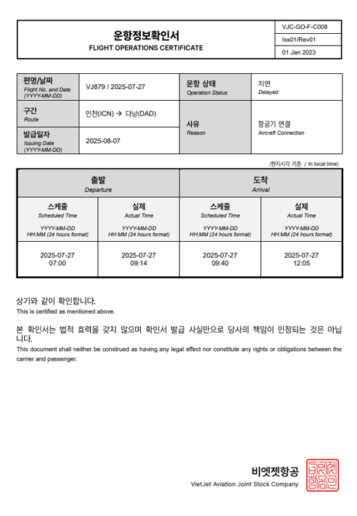 ※ 다른 보험사인 경우 항공 지연 확인서(운항정보확인서)를 제출해야 하는 경우가 있는데 Vietjet항공인 경우에는 공항 서비스데스크에서 안내해준 QR로 직접 신청하시거나 예약서비스팀(02-319-4560)으로 문의하시면 메일로 보내주니 참고 바랍니다~ 항공권 예약번호 6자리 알려주셔야 합니다~~!!