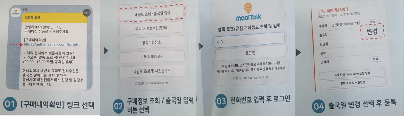 위사진은 유심과 같이 동봉되는 안내장에 있는 것으로 그대로 하면 누구나 쉽게 할 수 있다. 그런데 마지막 변경 부분에서 출국일을 설정하고 화면이 다음으로 넘어가지 않아 '이게 된 게 맞나' 하고 계속 체크를 했었다. 잘 입력이 된 것이니 너무 걱정할 필요는 없겠다.