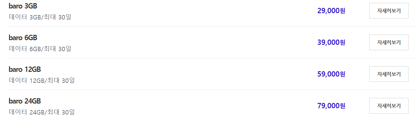 핸드폰을 로밍을 하면 통신사별로 금액은 비슷하고 모두 데이터가 정해져있다.